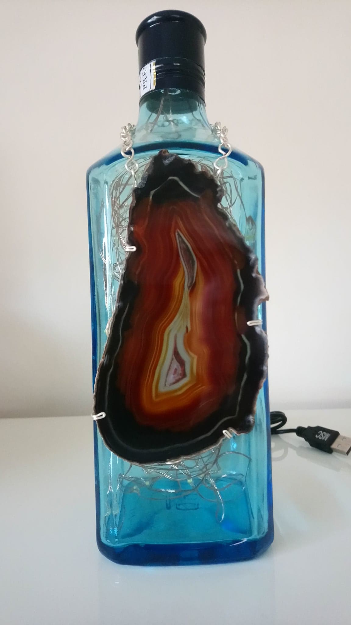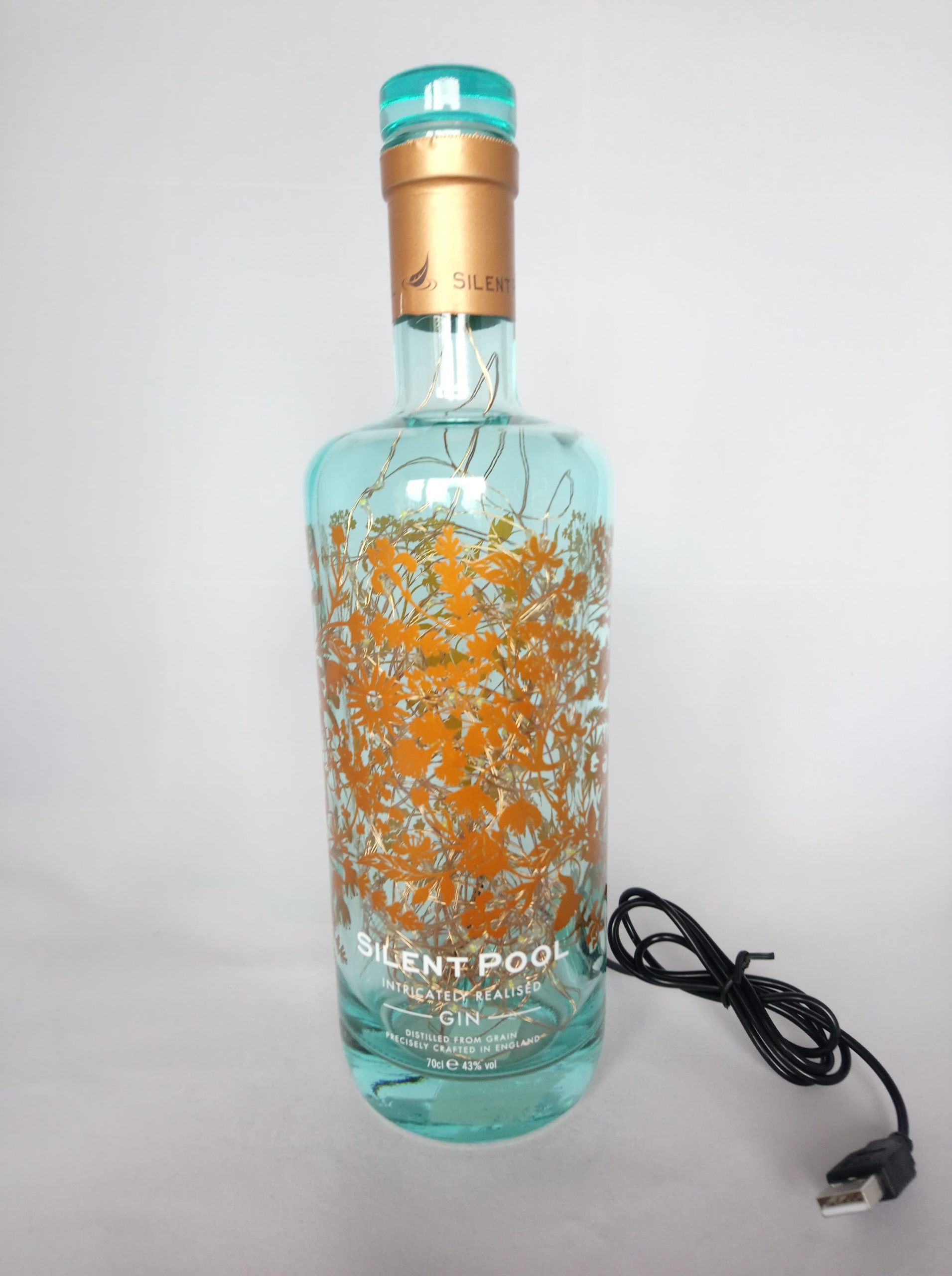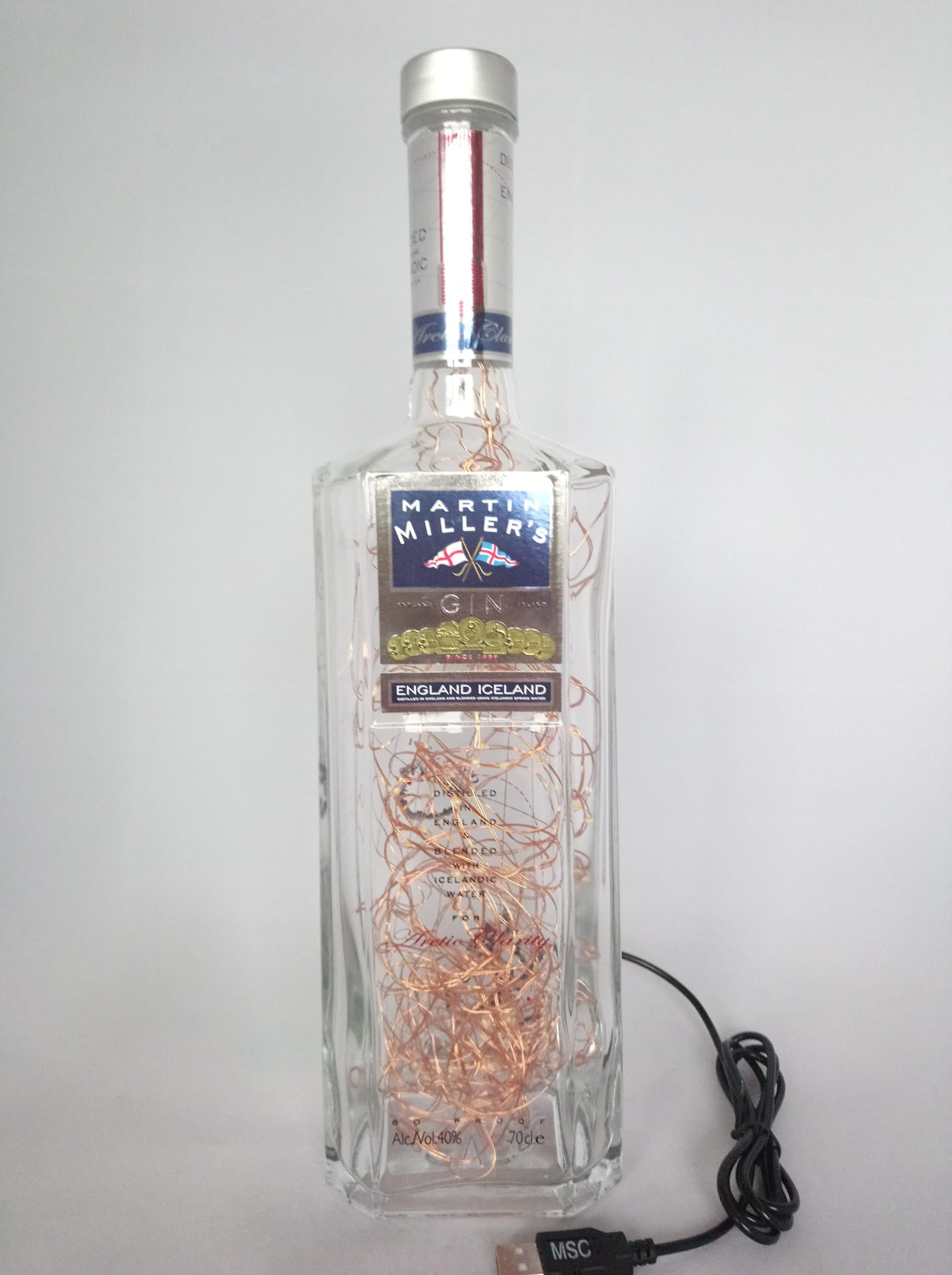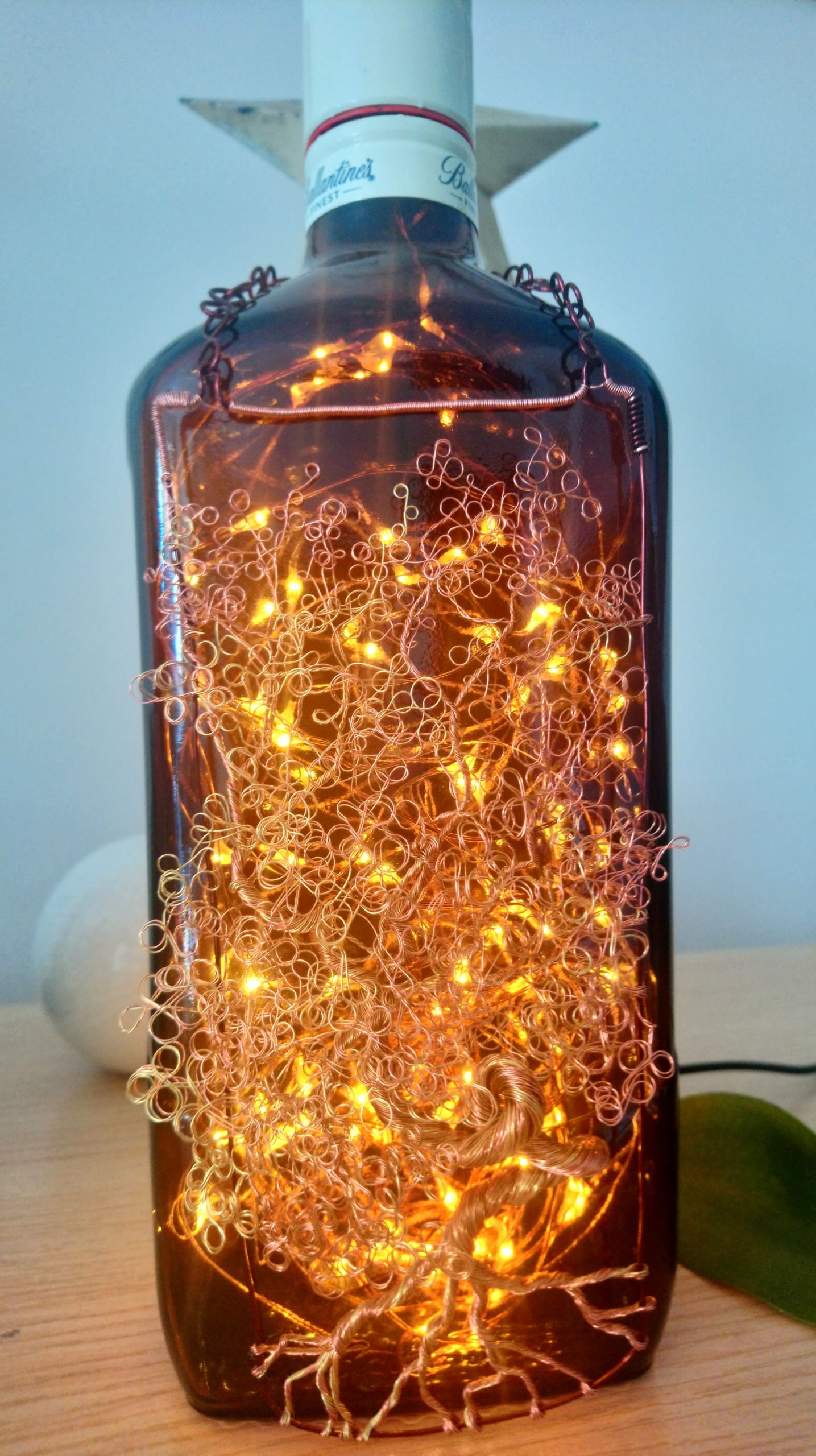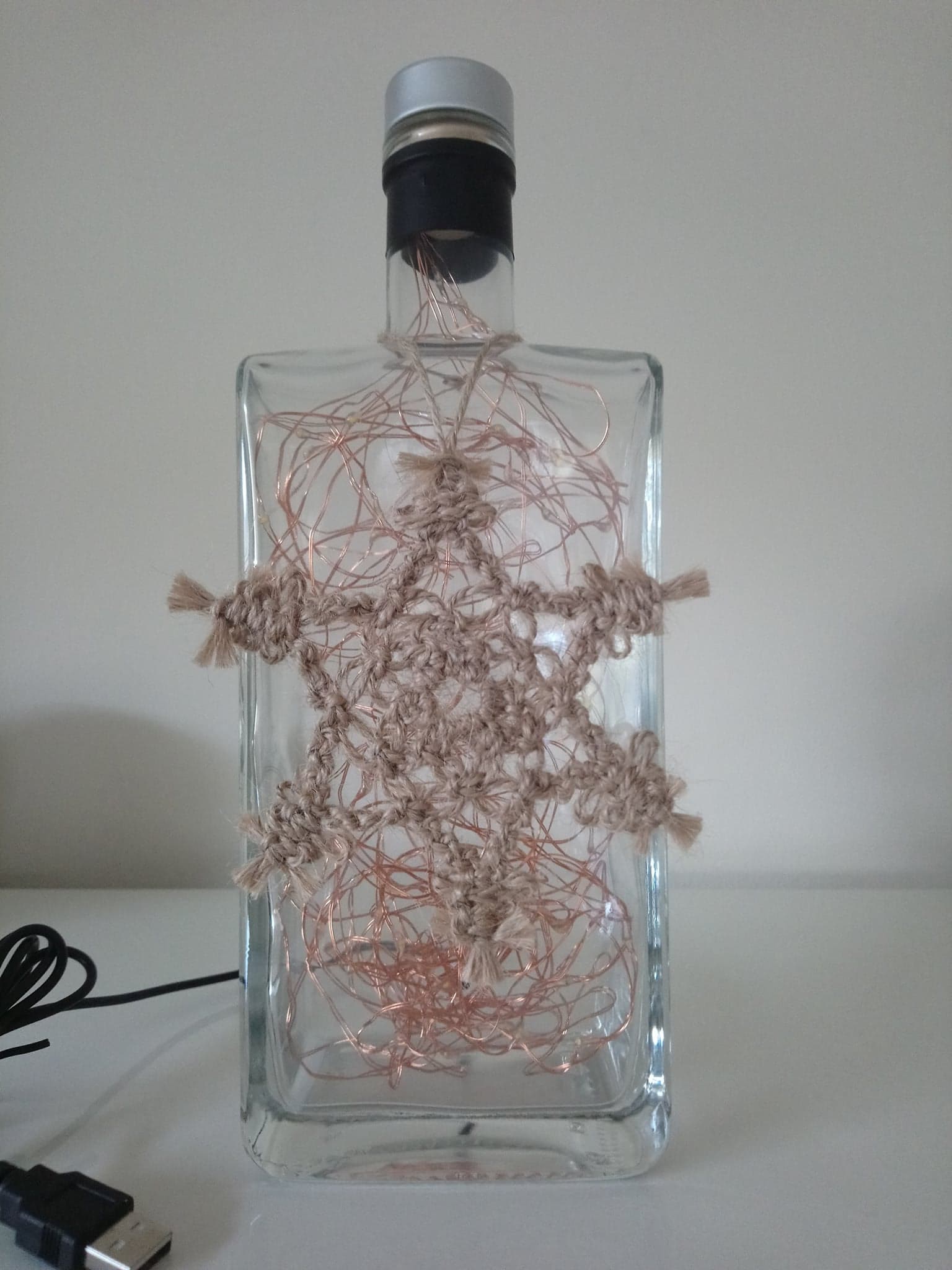 So, here’s the deal: the bottles are thoroughly cleaned, drilled and filled with mains powered bright LED string lights on a fine copper wire with a USB cable that has to be connected to a mains plug. (This isn’t included; I’m sure you’ll have one at home somewhere already.)