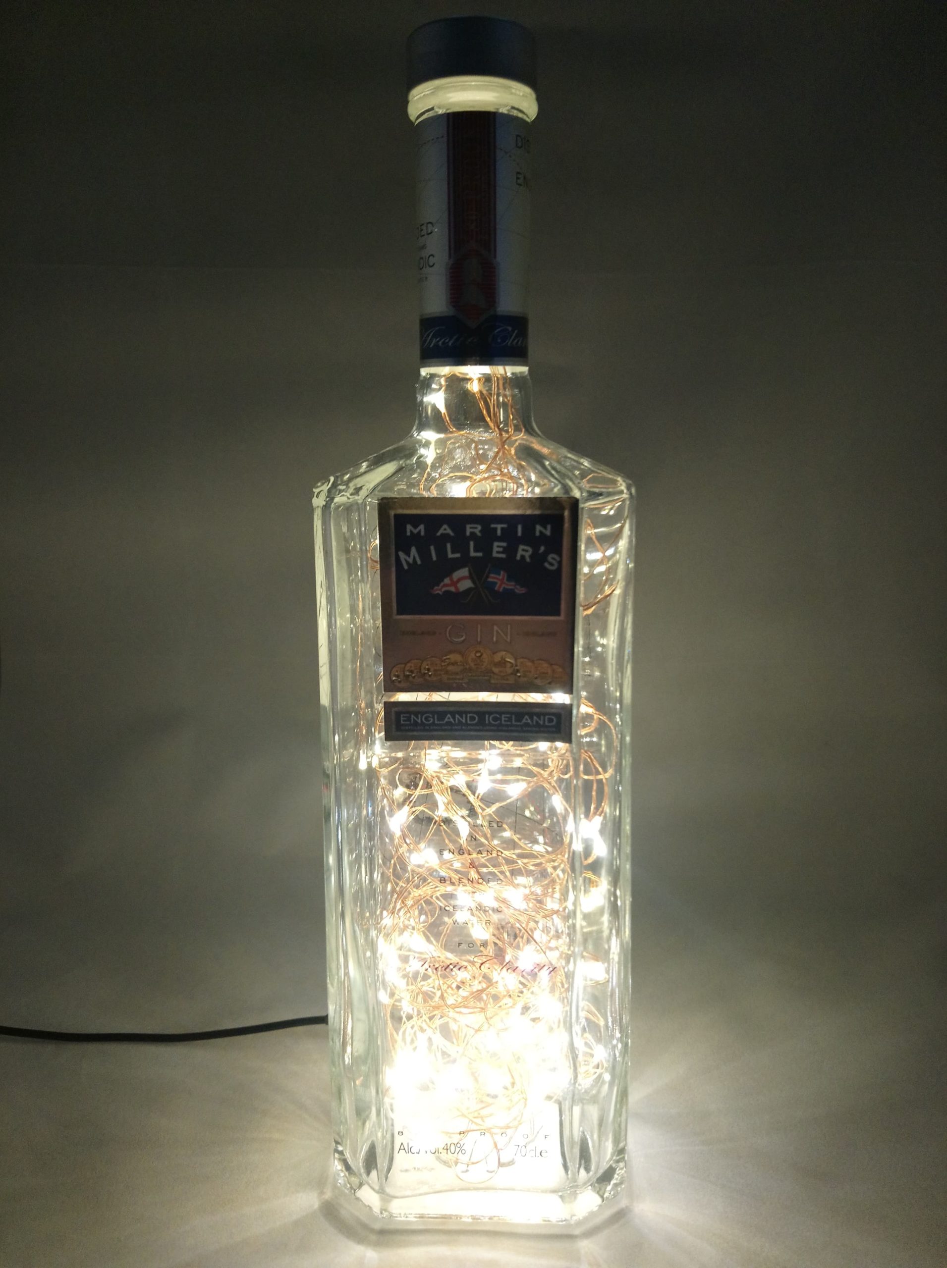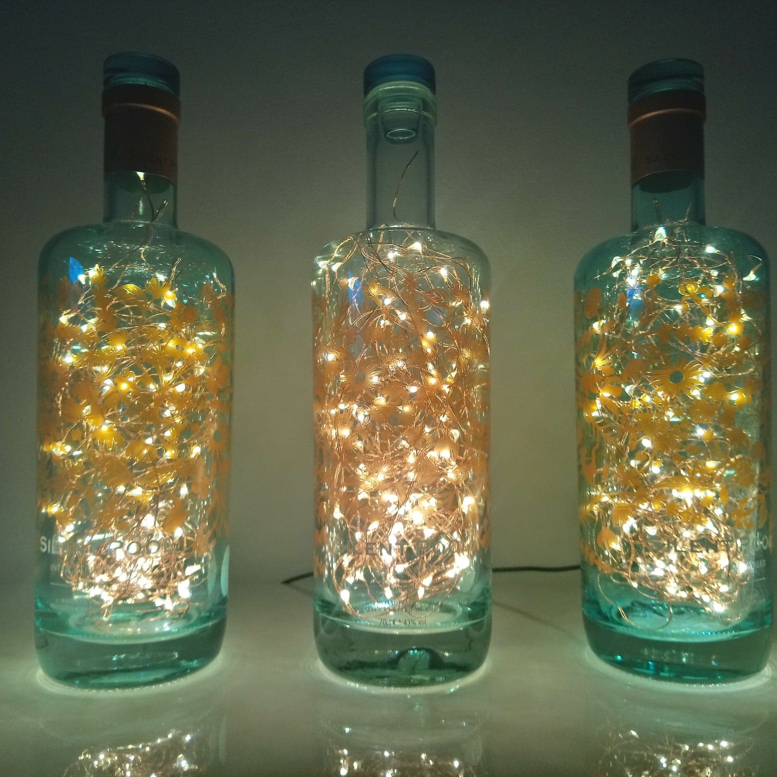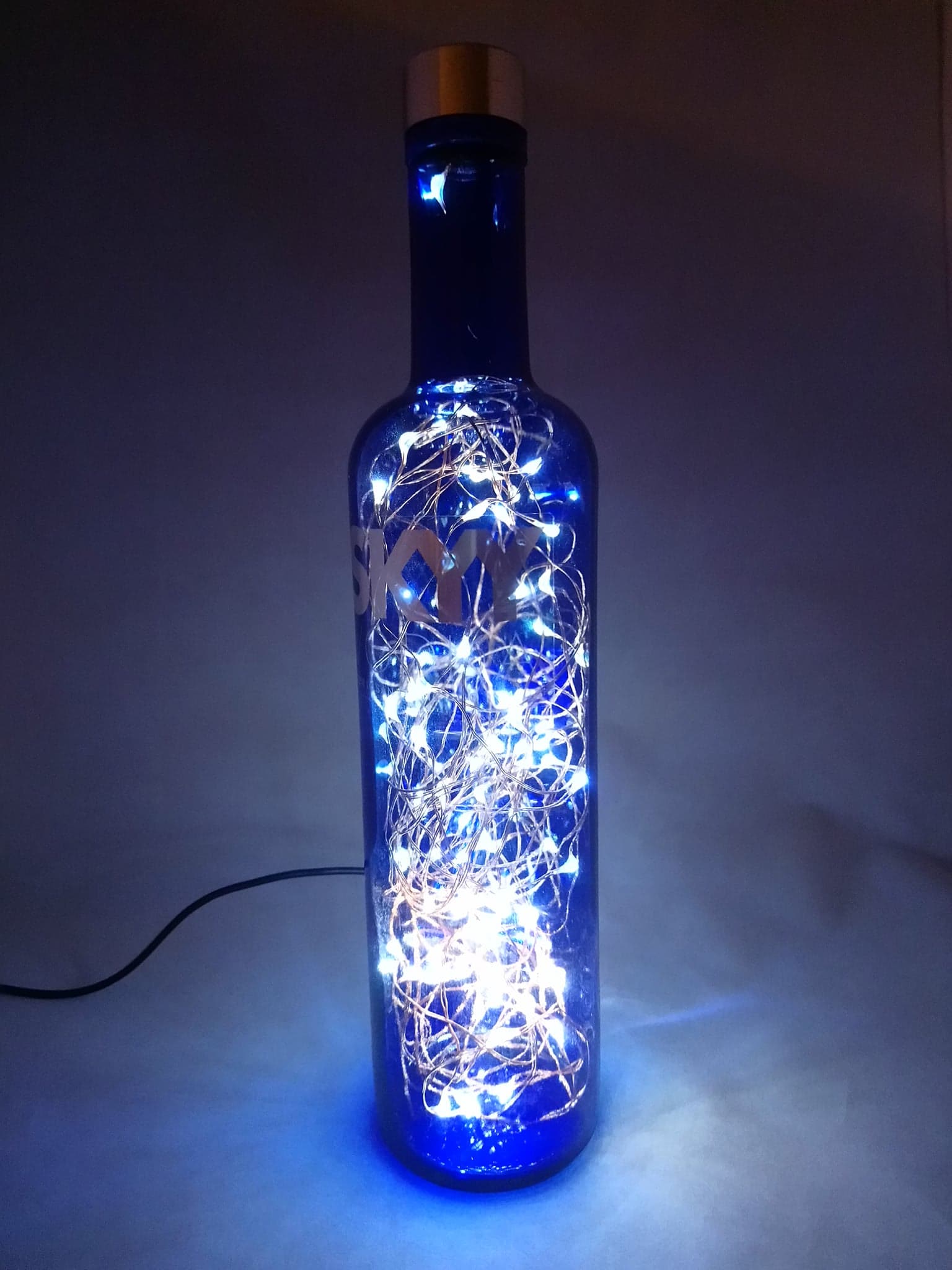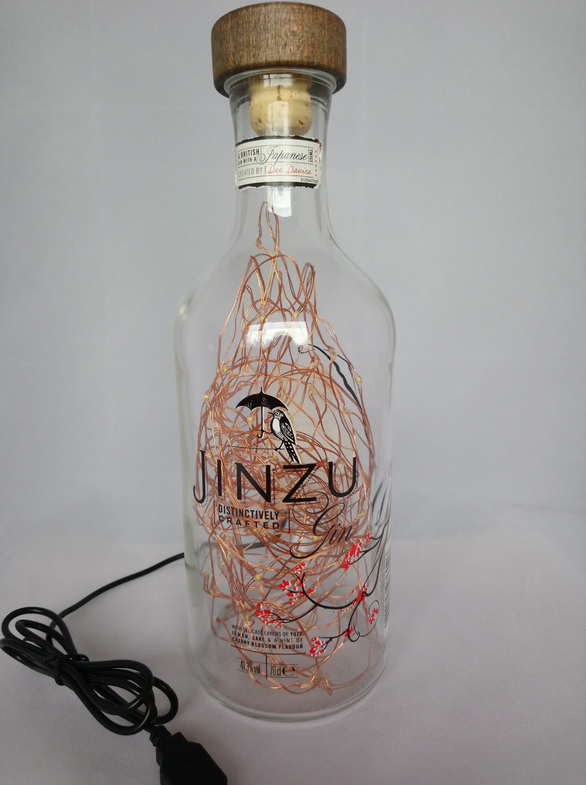 So, here’s the deal: the bottles are thoroughly cleaned, drilled and filled with mains powered bright LED string lights on a fine copper wire with a USB cable that has to be connected to a mains plug. (This isn’t included; I’m sure you’ll have one at home somewhere already.)
