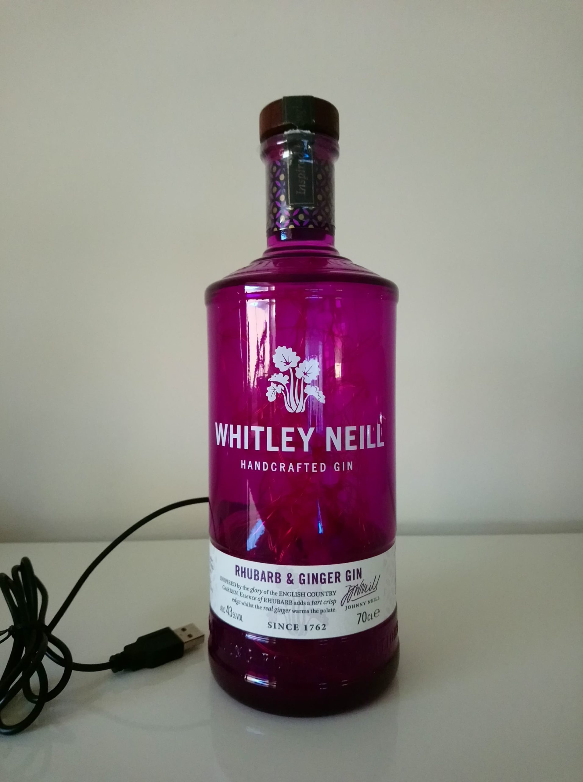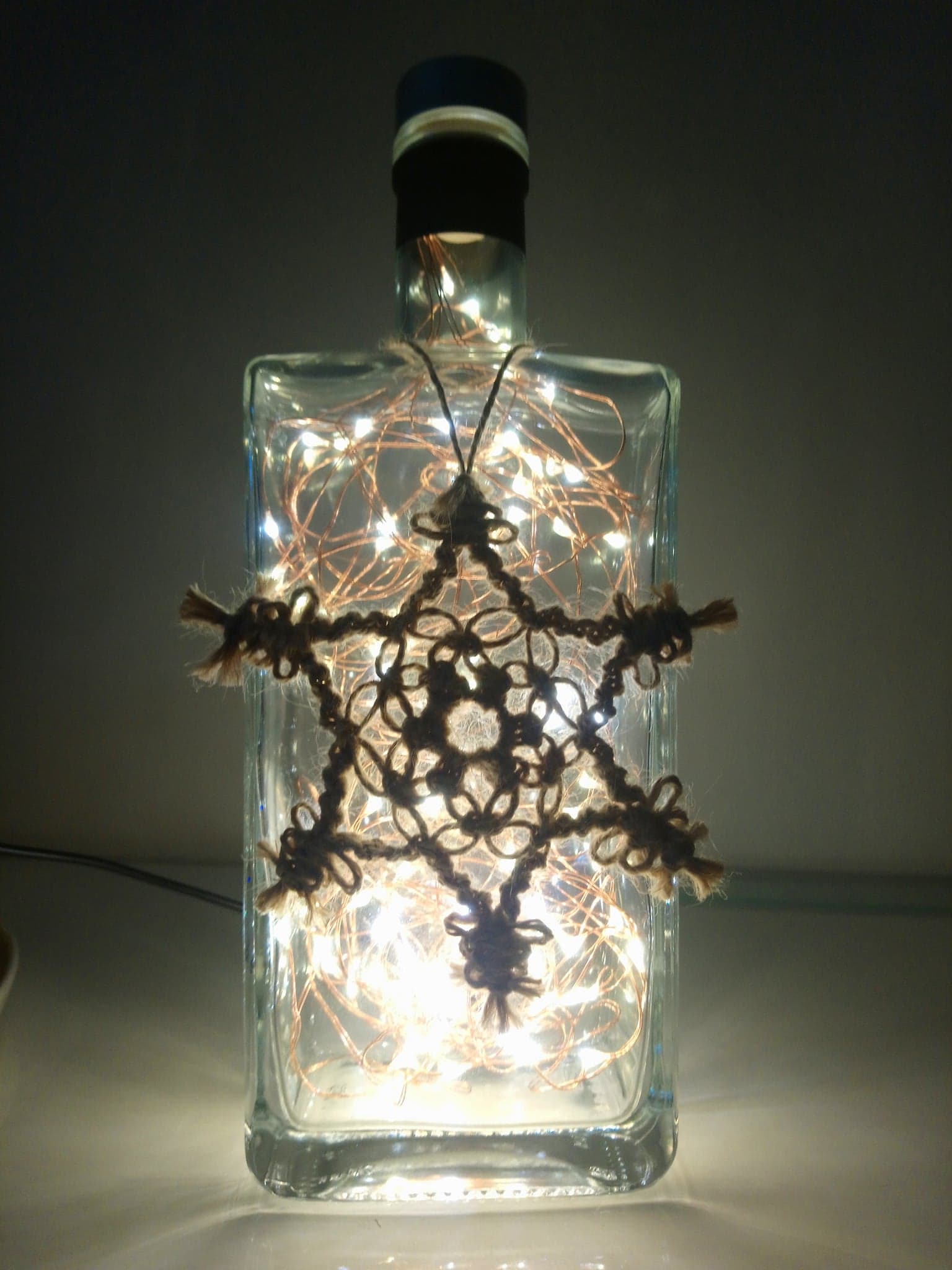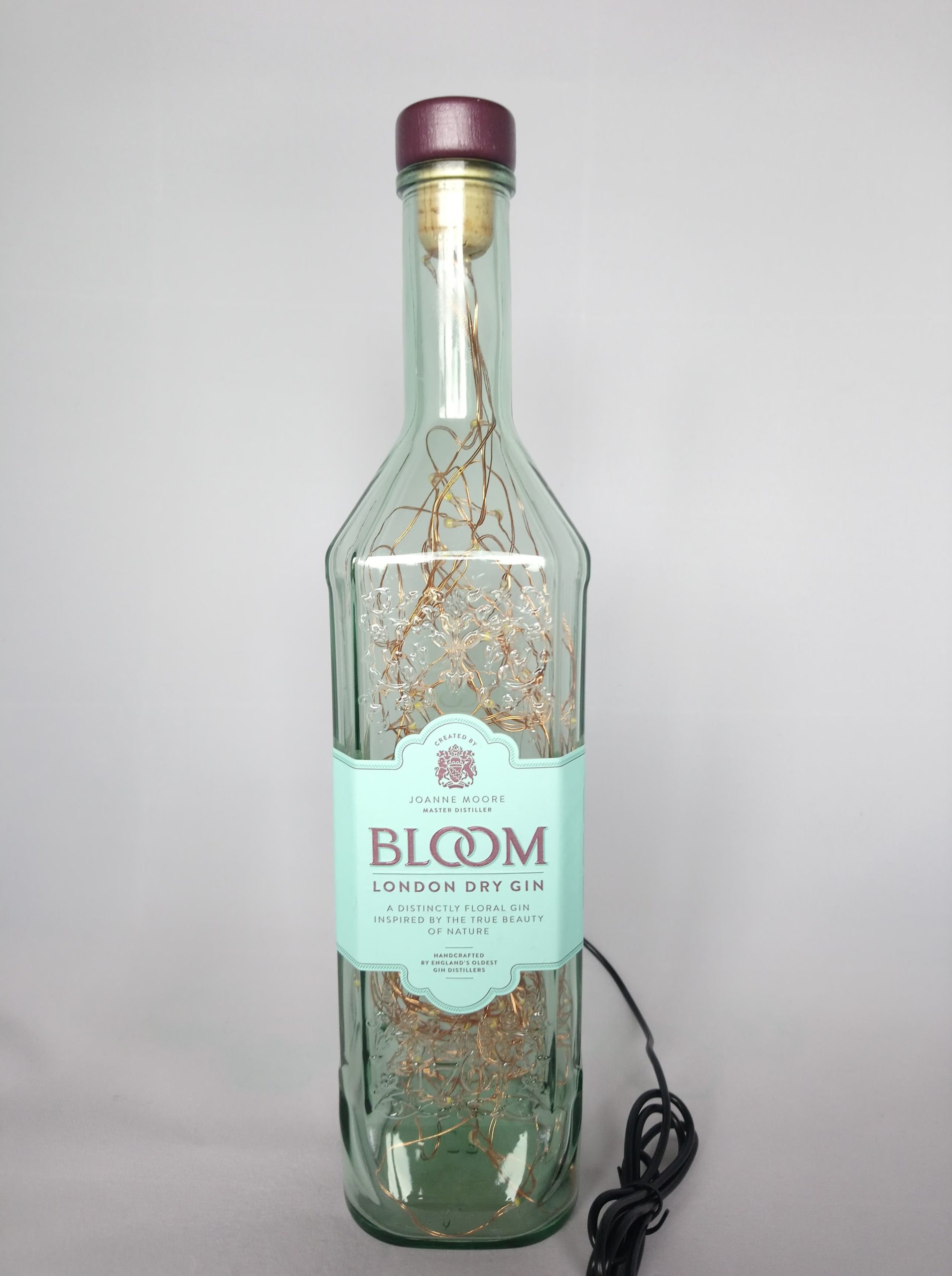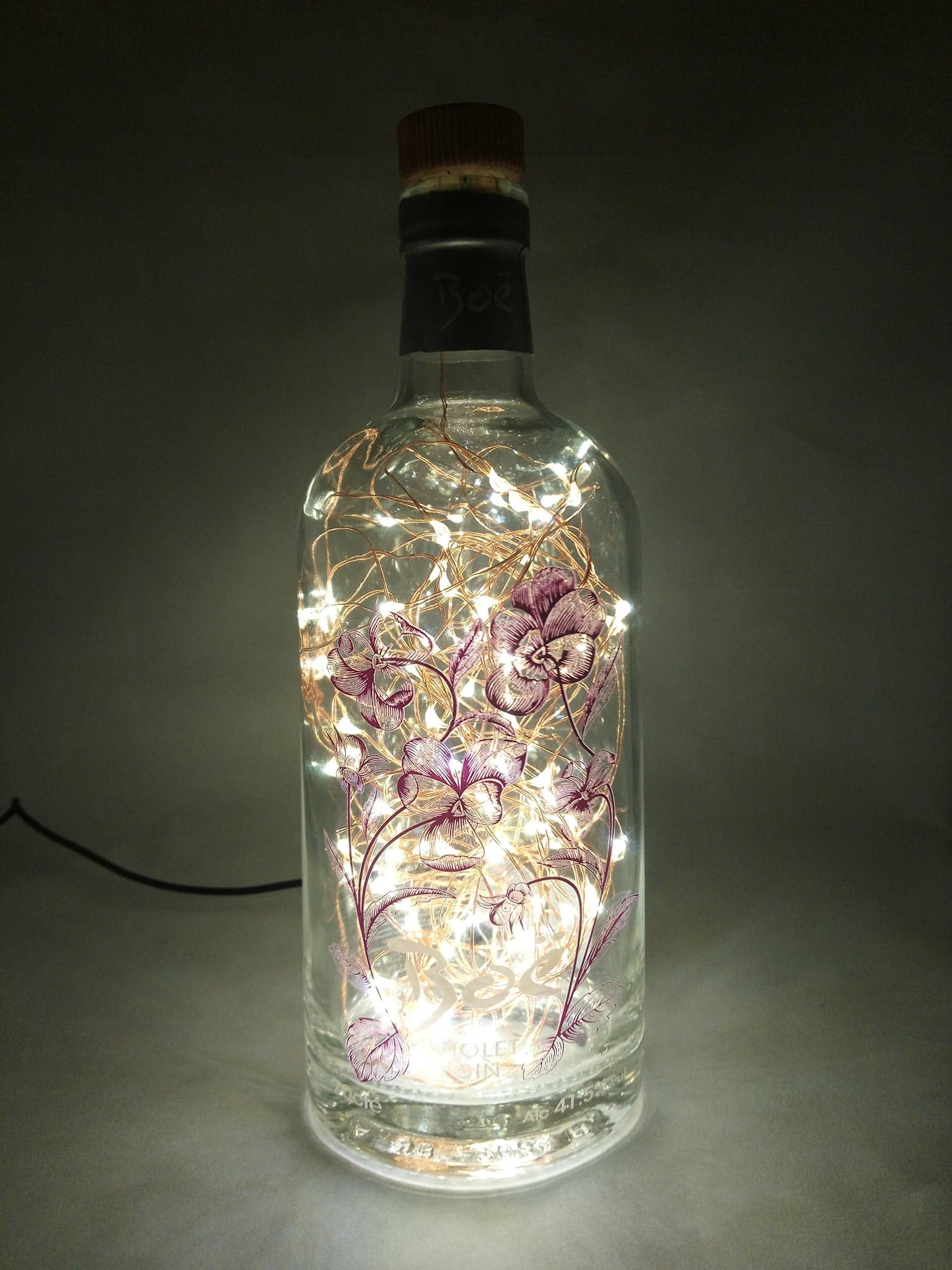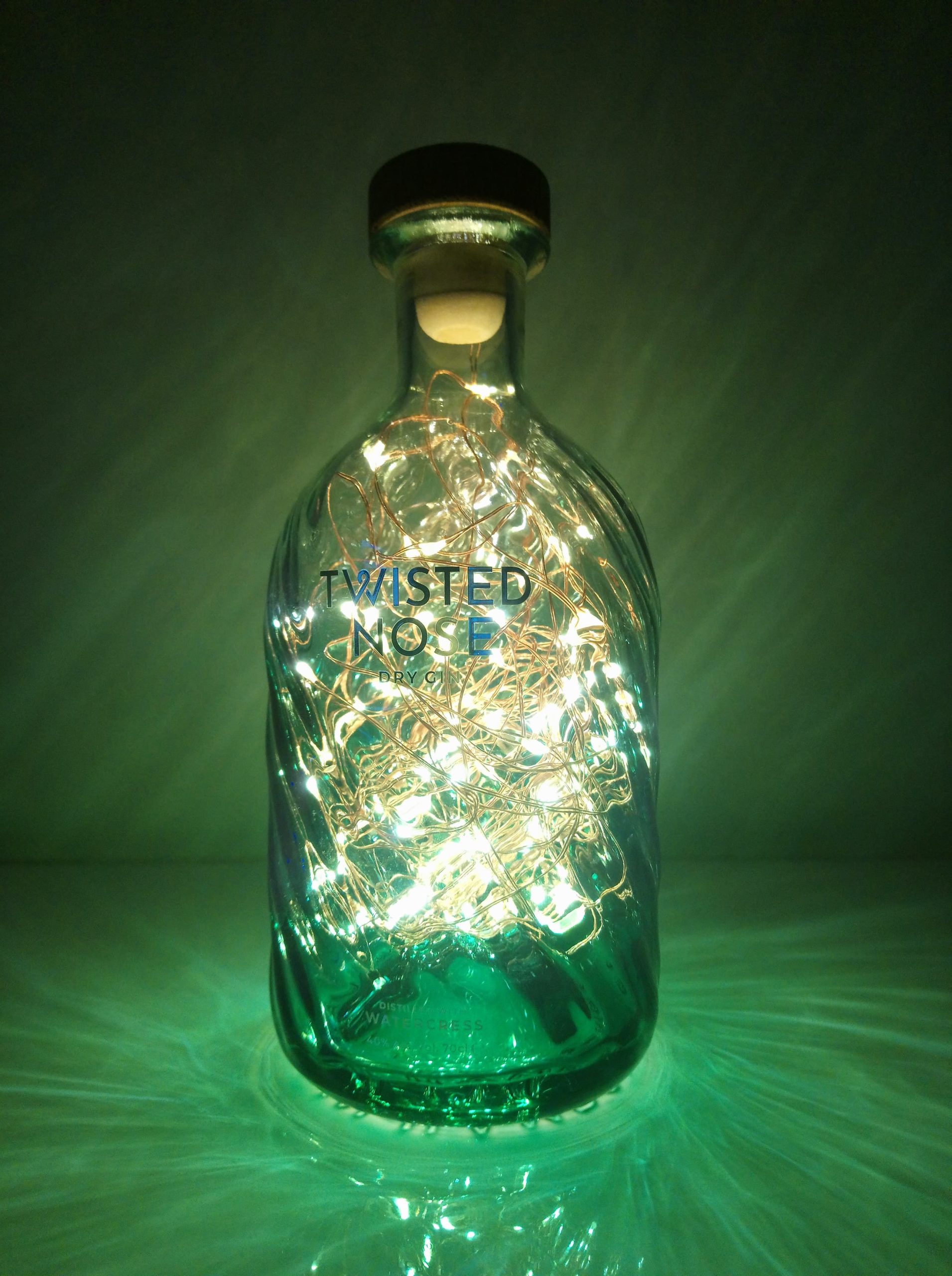 So, here’s the deal: the bottles are thoroughly cleaned, drilled and filled with mains powered bright LED string lights on a fine copper wire with a USB cable that has to be connected to a mains plug. (This isn’t included; I’m sure you’ll have one at home somewhere already.)