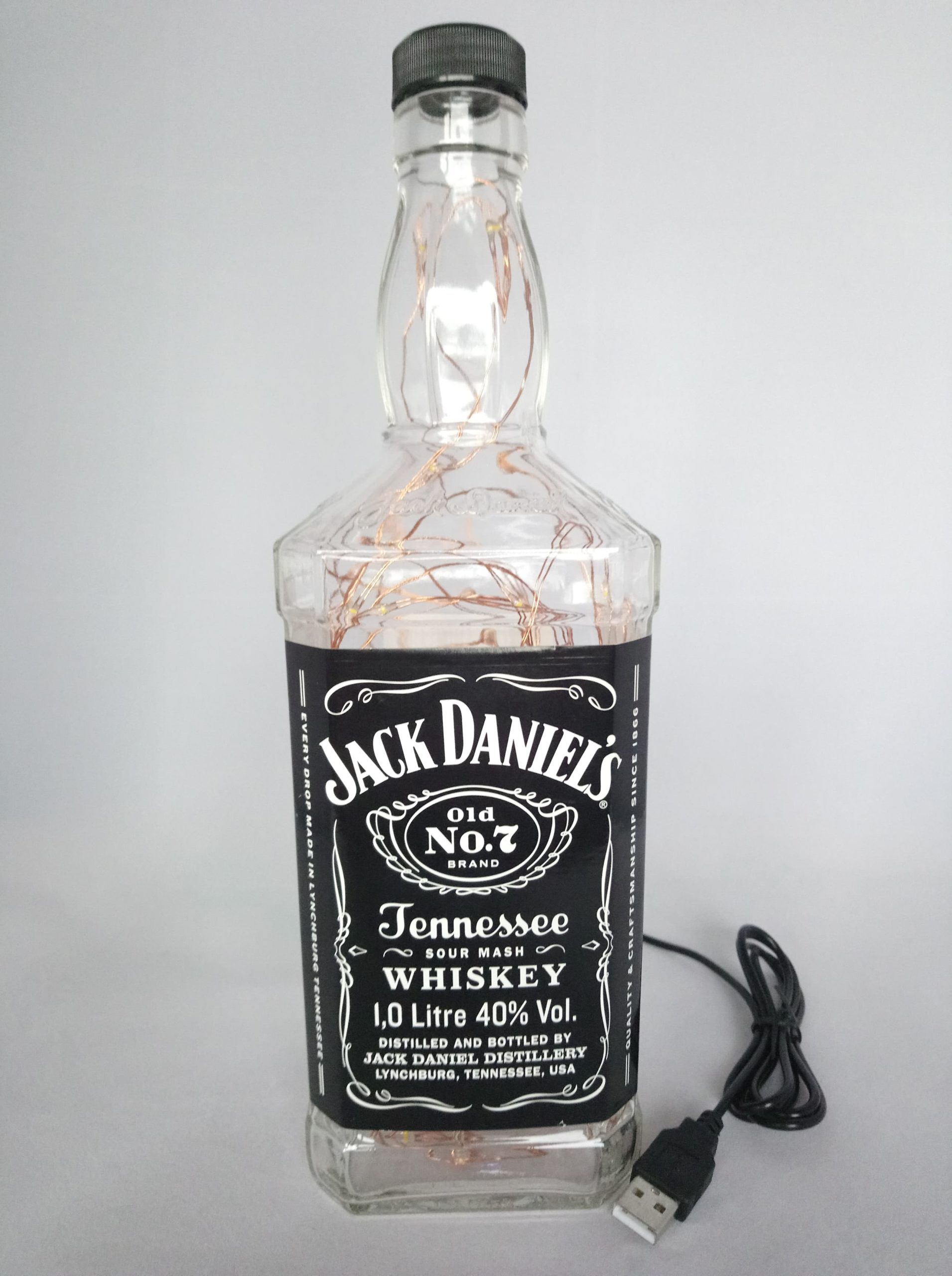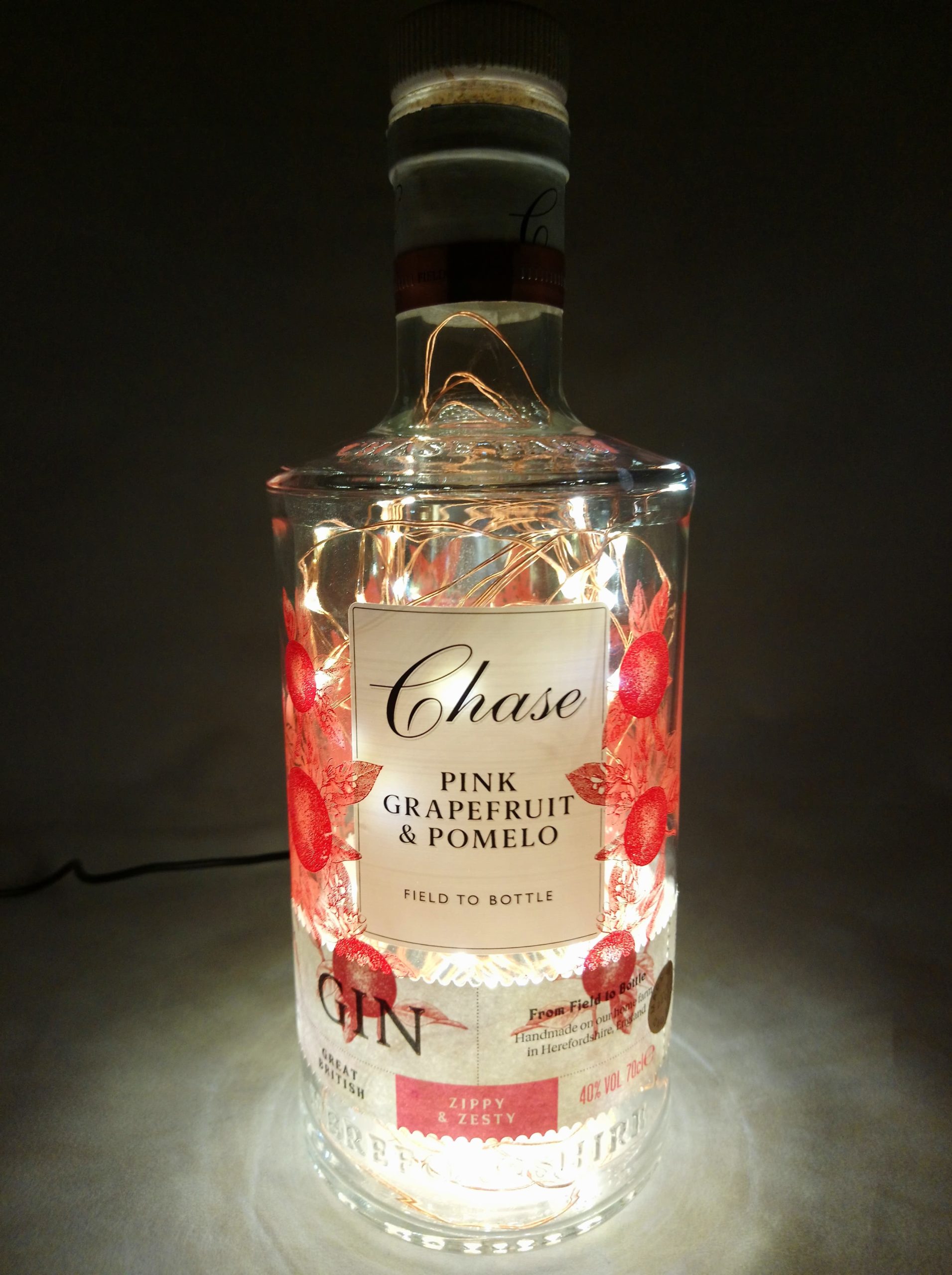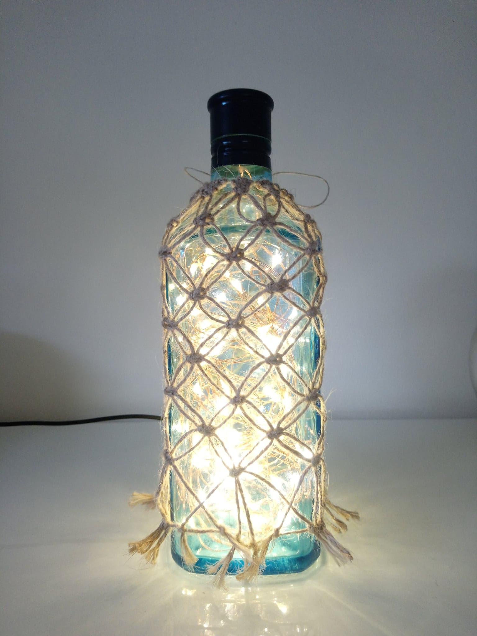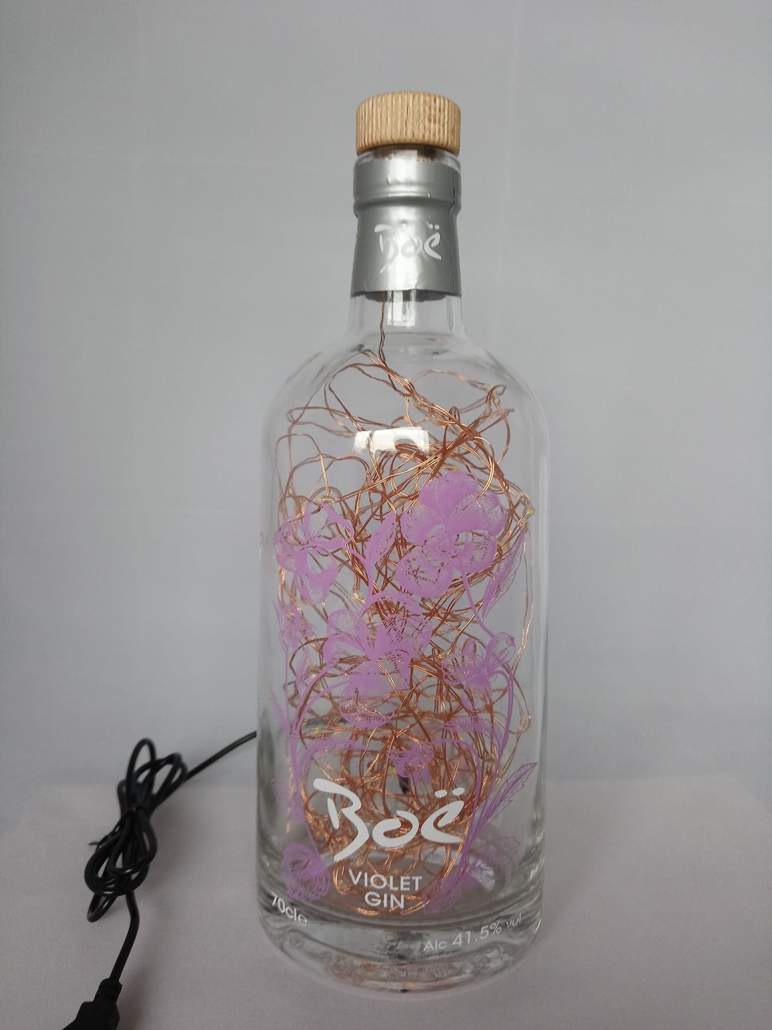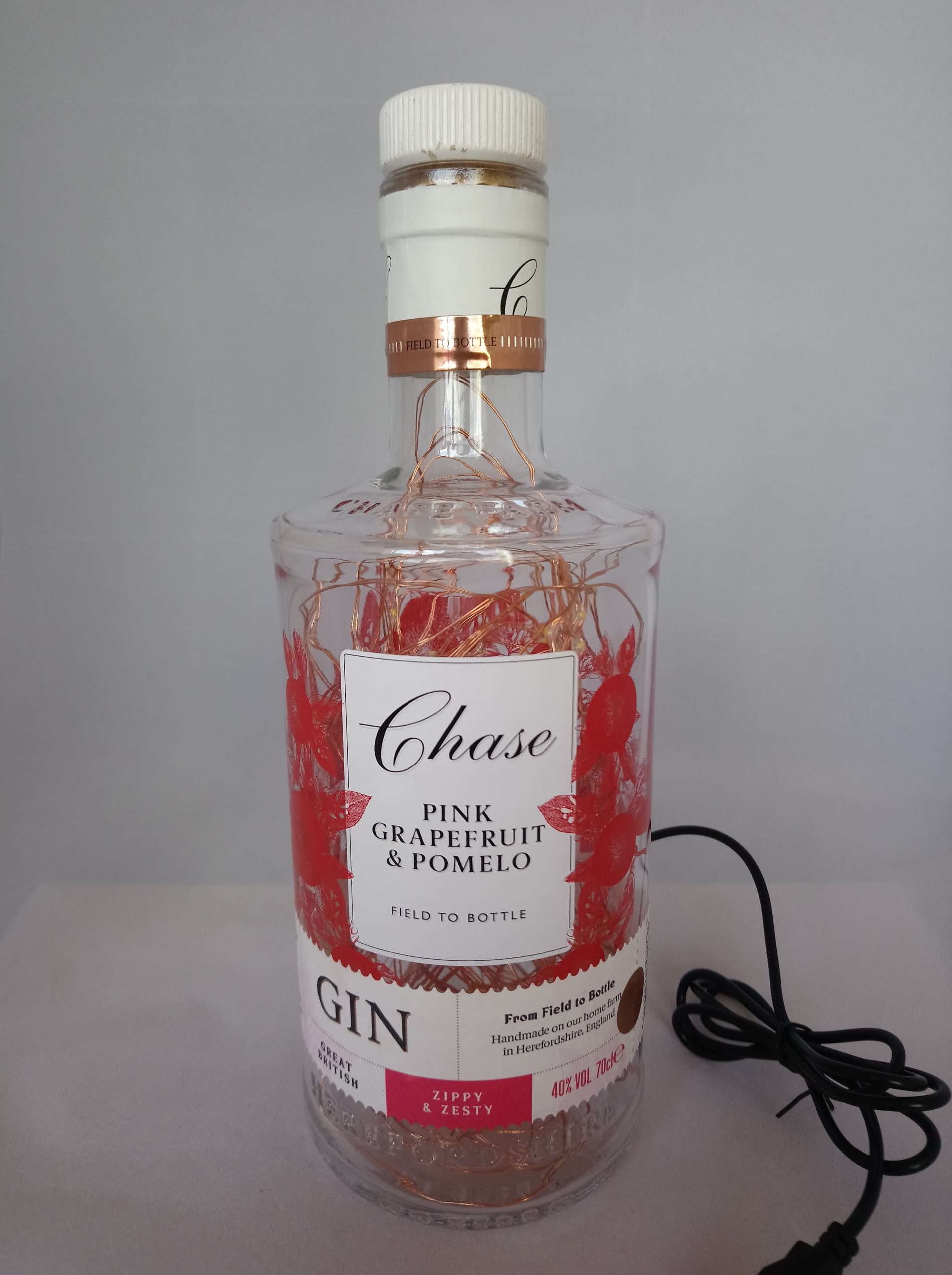 So, here’s the deal: the bottles are thoroughly cleaned, drilled and filled with mains powered bright LED string lights on a fine copper wire with a USB cable that has to be connected to a mains plug. (This isn’t included; I’m sure you’ll have one at home somewhere already.)