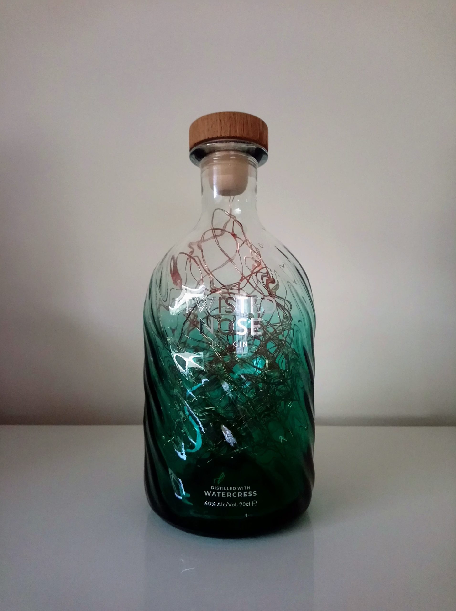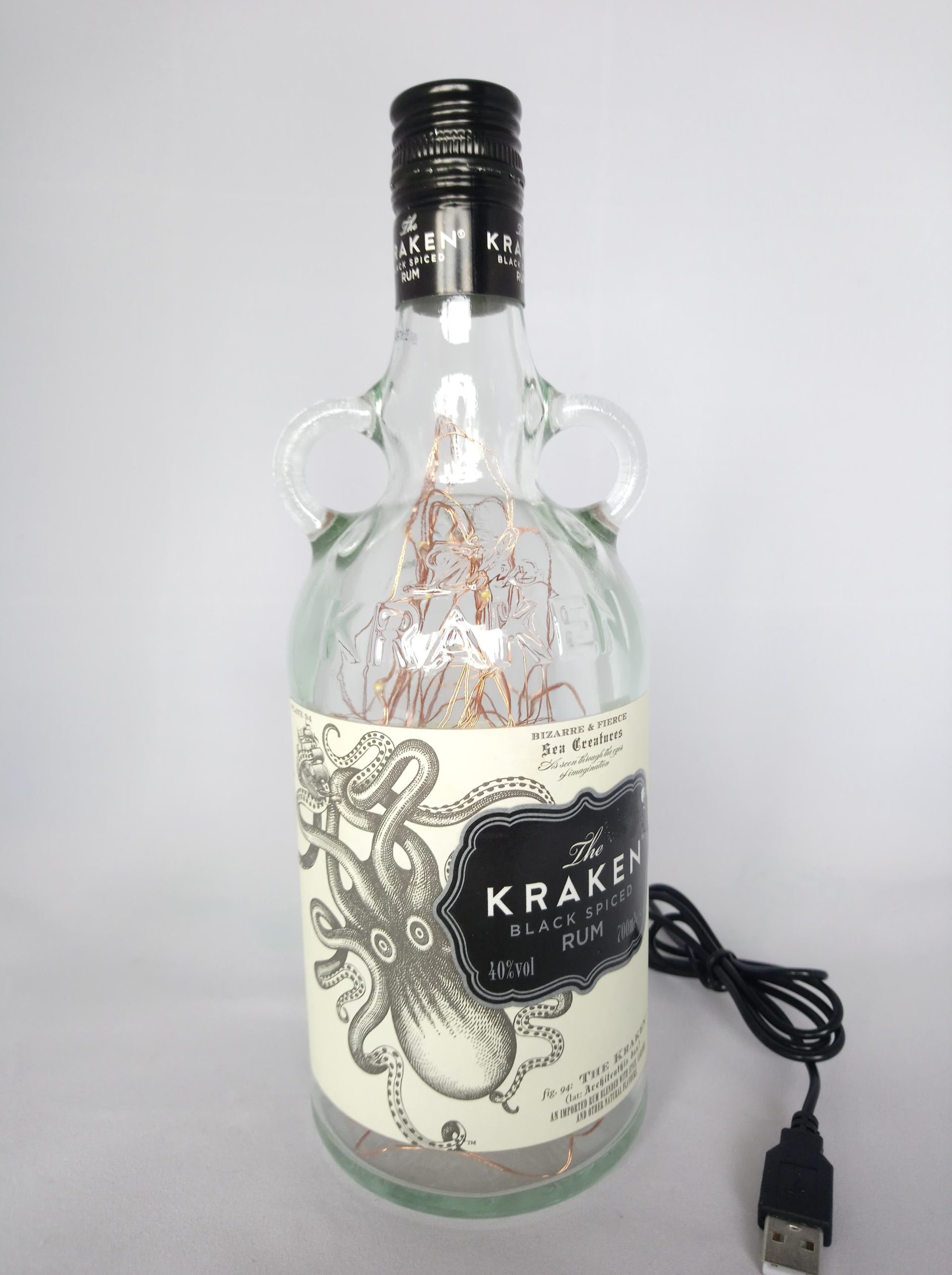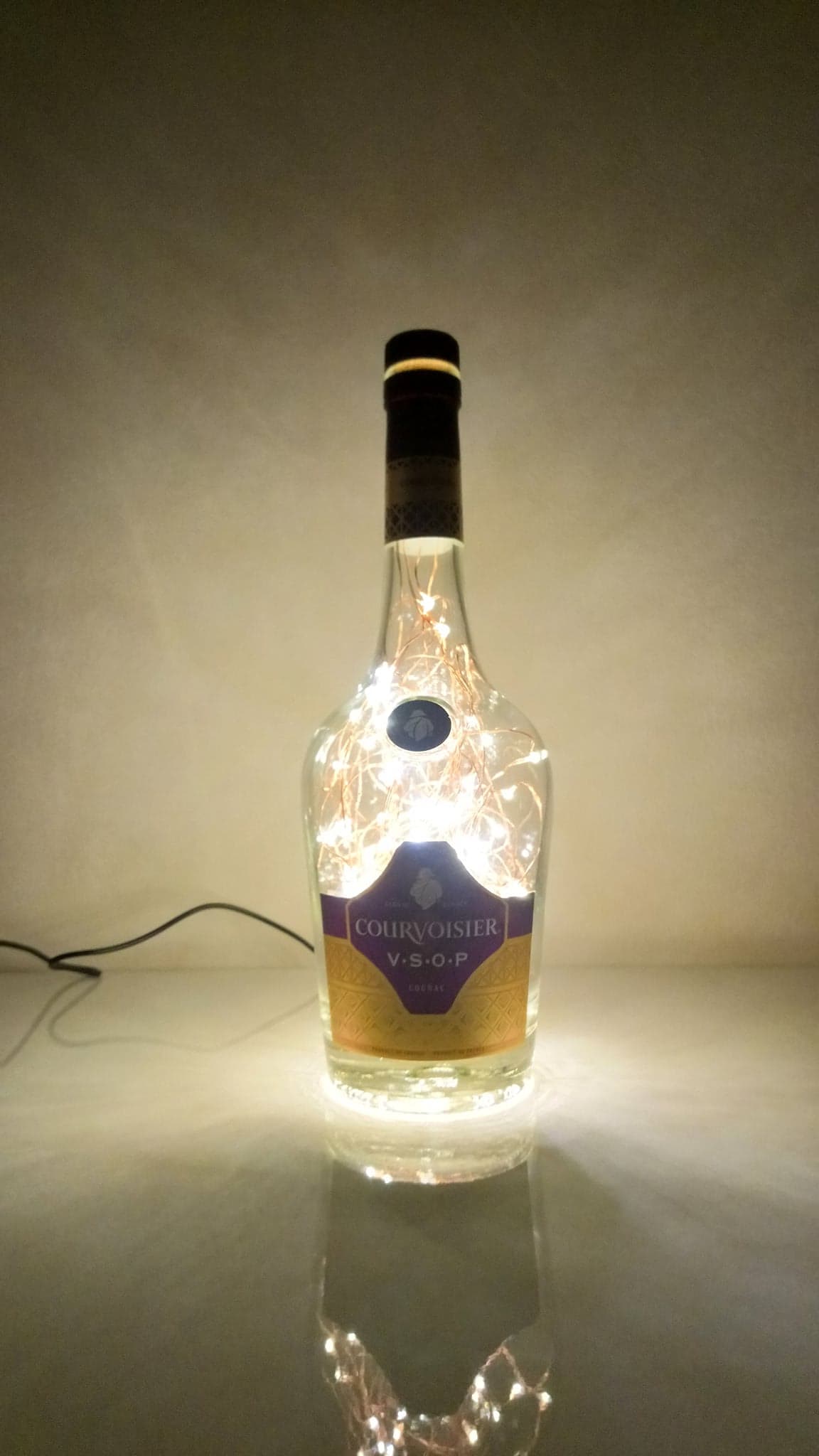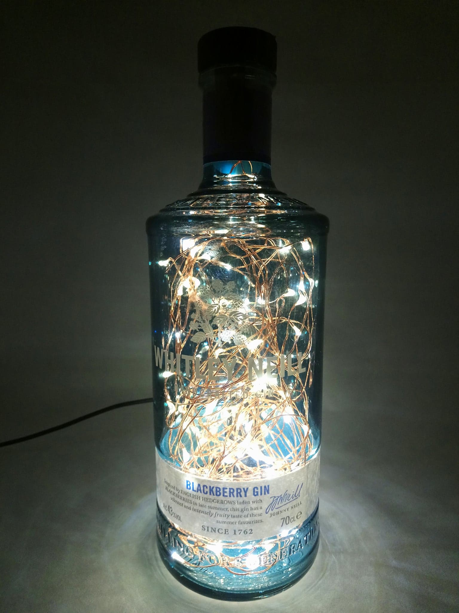 So, here’s the deal: the bottles are thoroughly cleaned, drilled and filled with mains powered bright LED string lights on a fine copper wire with a USB cable that has to be connected to a mains plug. (This isn’t included; I’m sure you’ll have one at home somewhere already.)