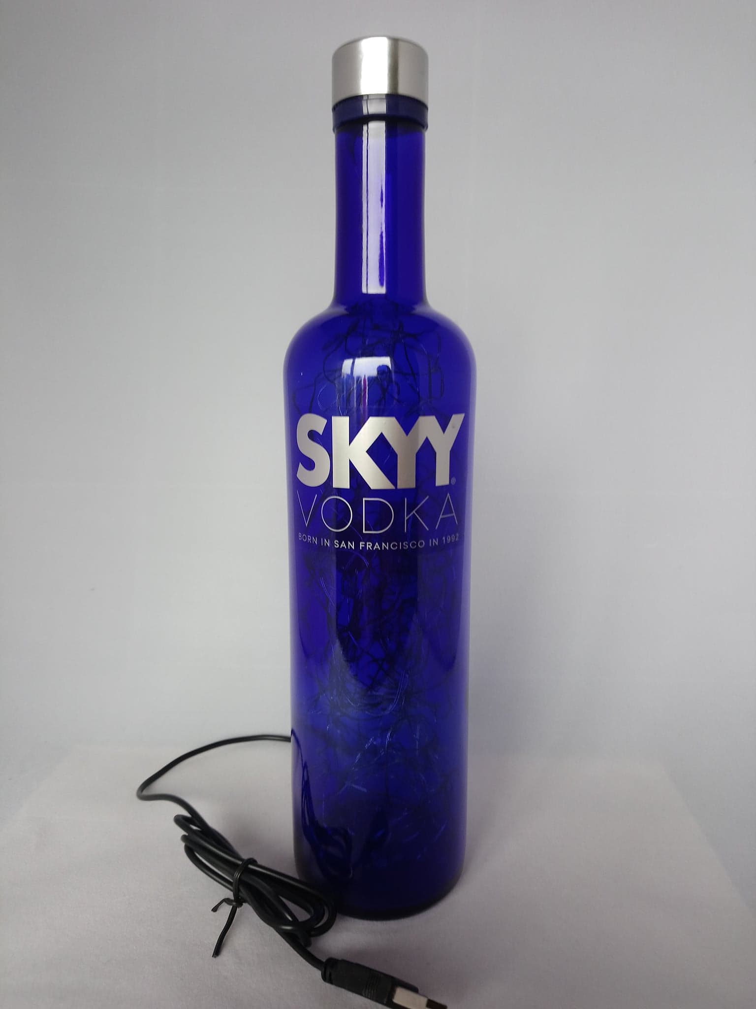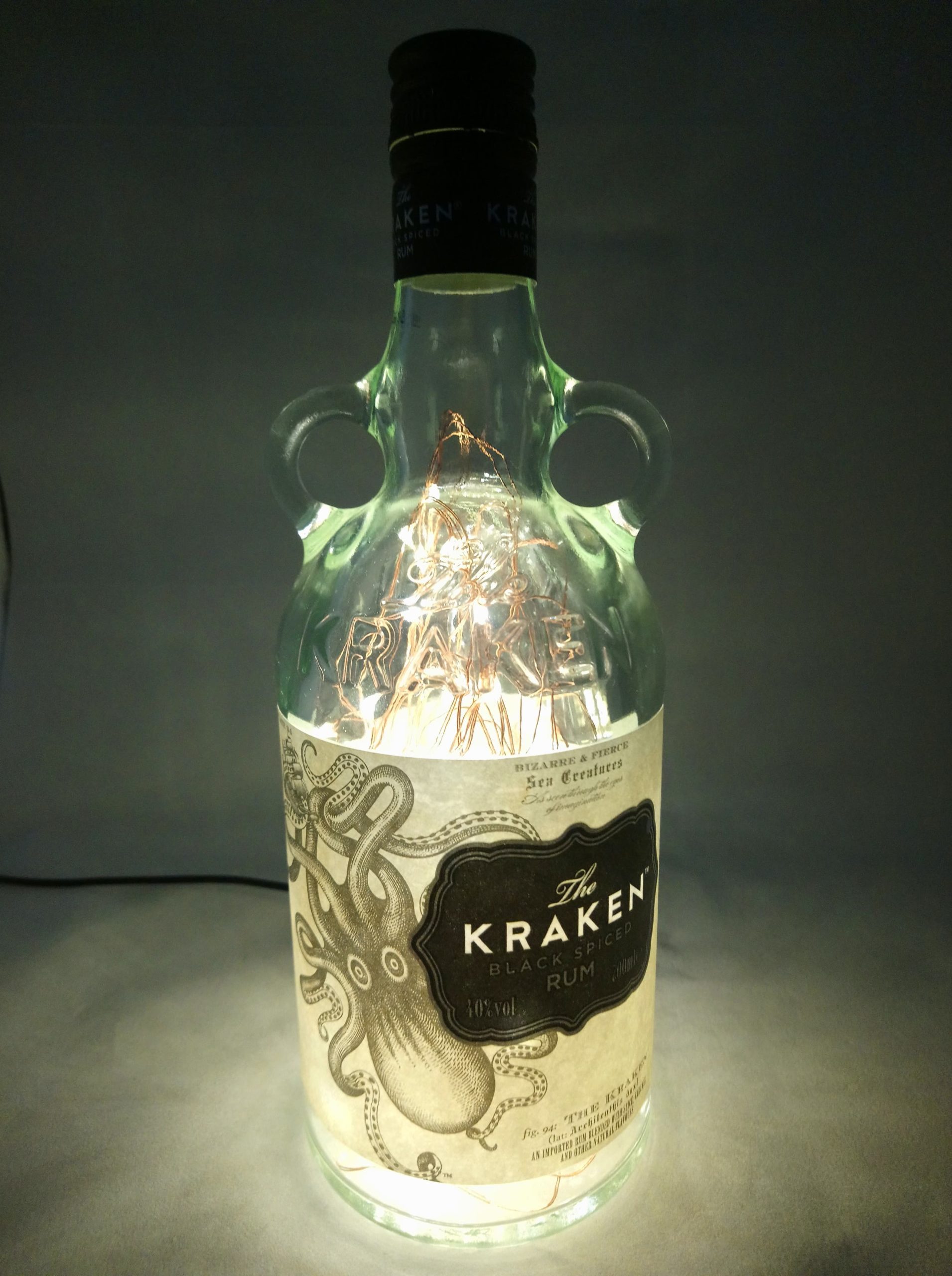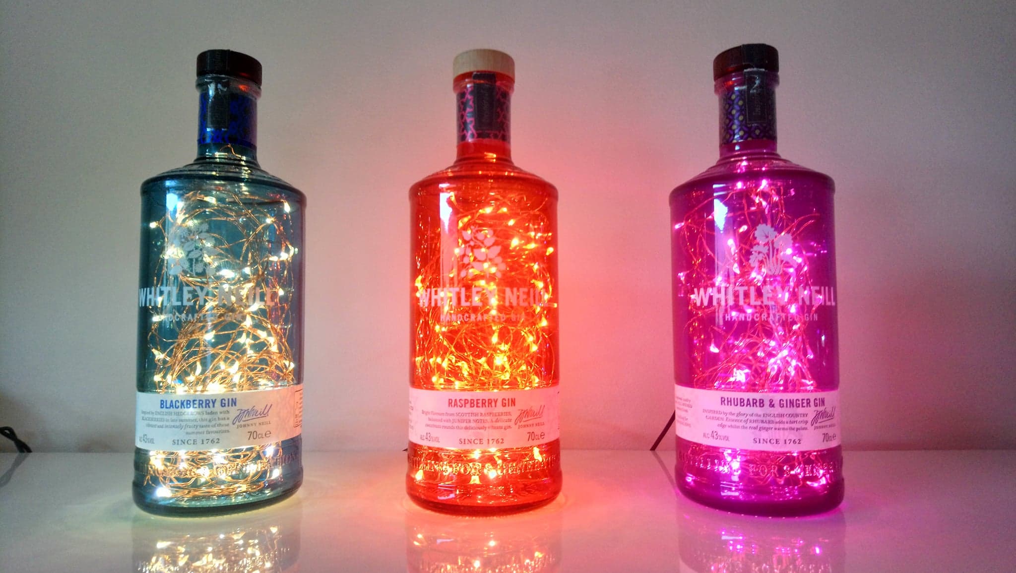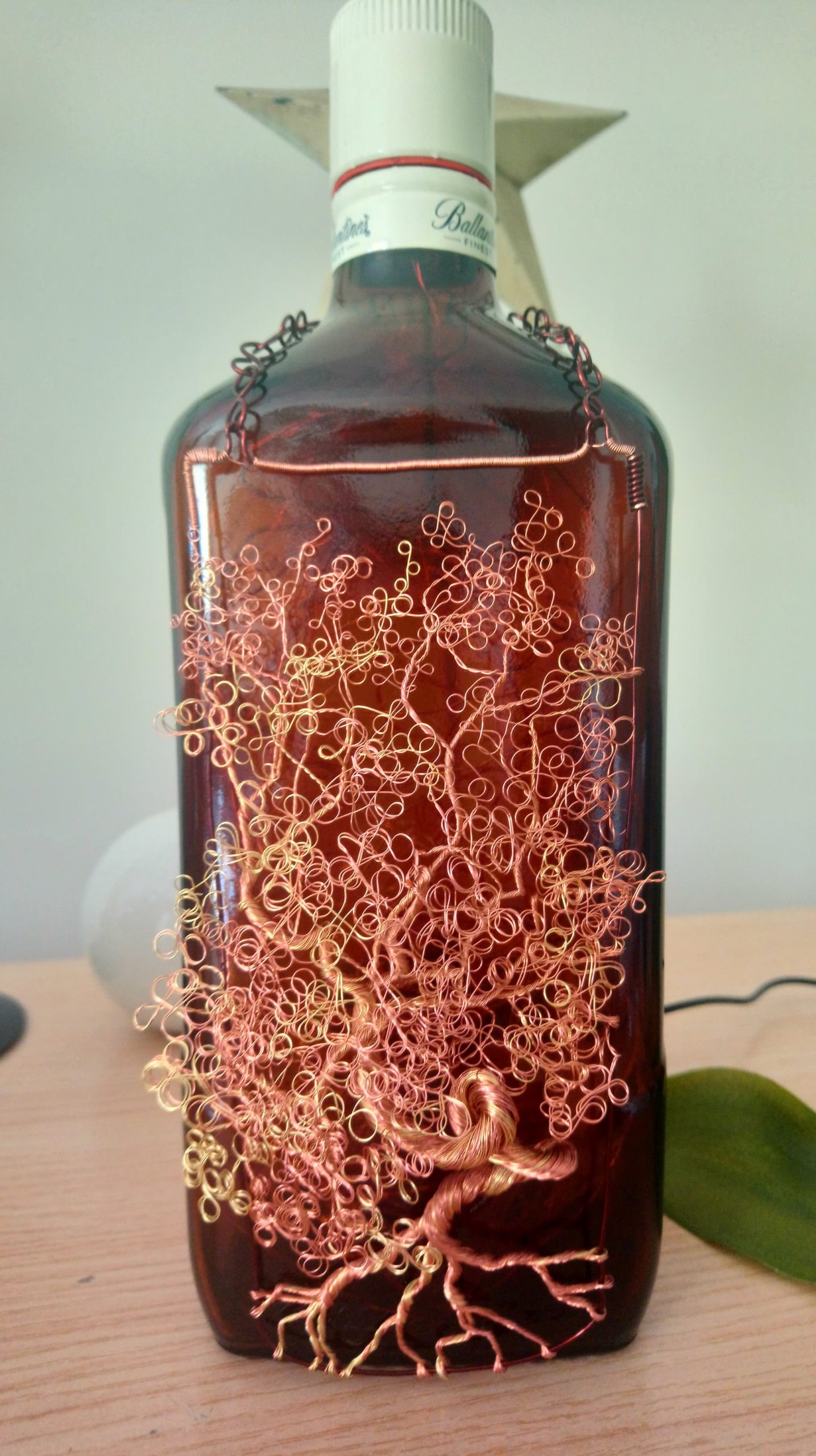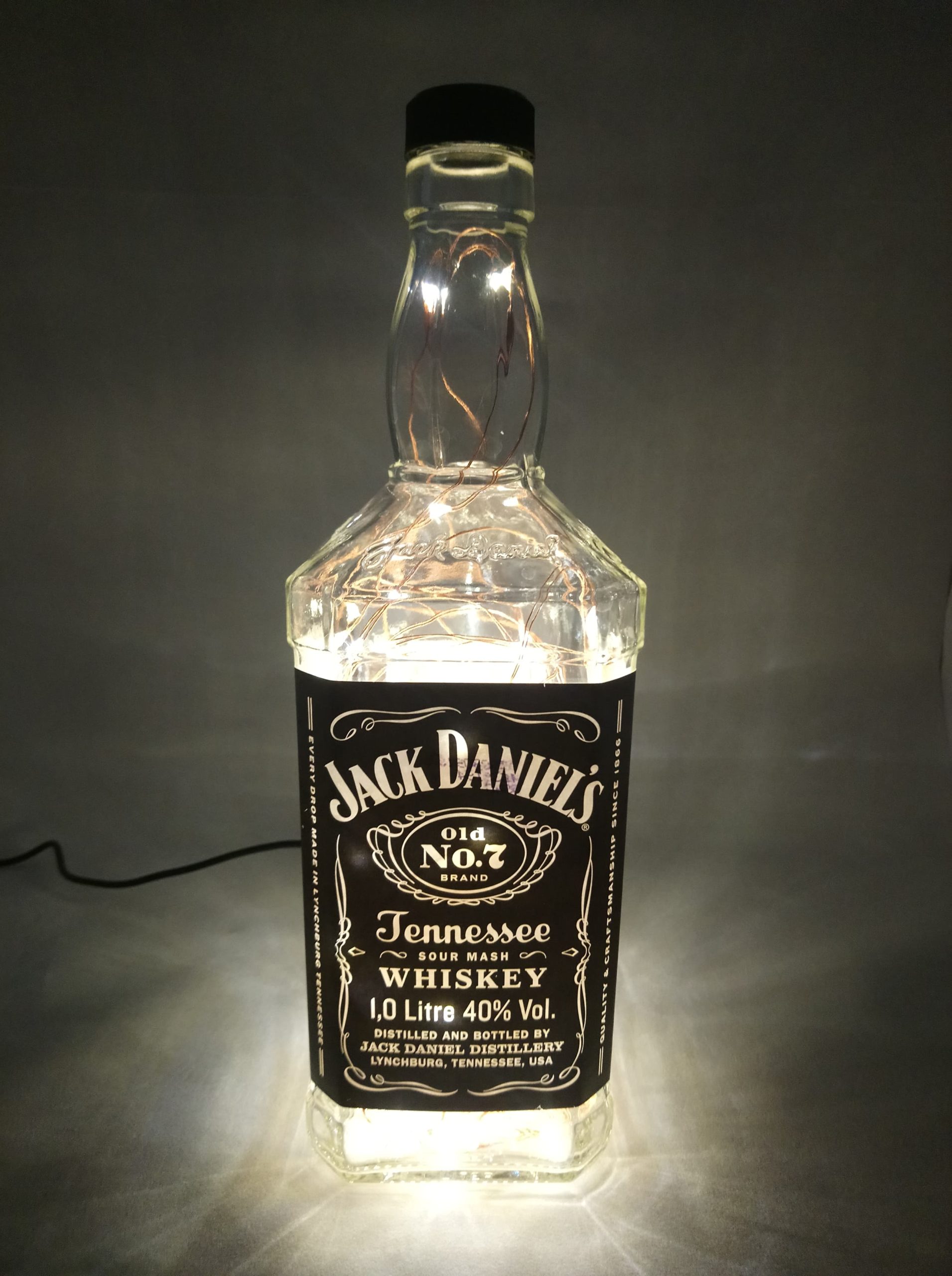 So, here’s the deal: the bottles are thoroughly cleaned, drilled and filled with mains powered bright LED string lights on a fine copper wire with a USB cable that has to be connected to a mains plug. (This isn’t included; I’m sure you’ll have one at home somewhere already.)
