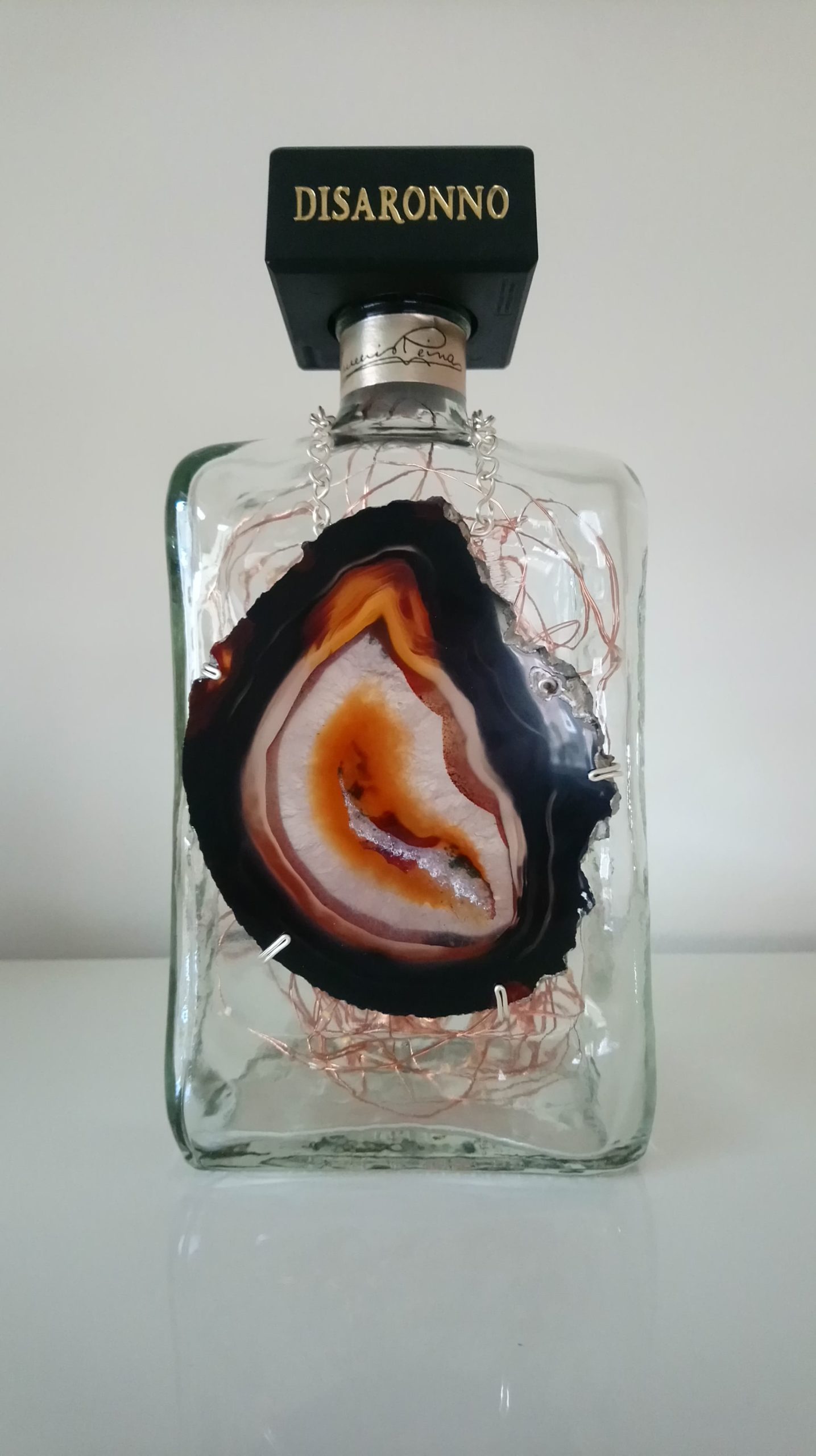 On my 21st birthday I was given a special bottle of Armagnac VSOP by my friends at S A Condom, my rugby club in France. To this day I kept the bottle (a litre and a half, now empty) with its personal inscription on the label and then I asked Kamila if she could add her magic and make this into a lamp. Lo and behold the result sits in my lounge with great pride. It is a work of beauty, it is a great memory and it is a lifelong reminder of my life and friends in France. Thanks Kamila.